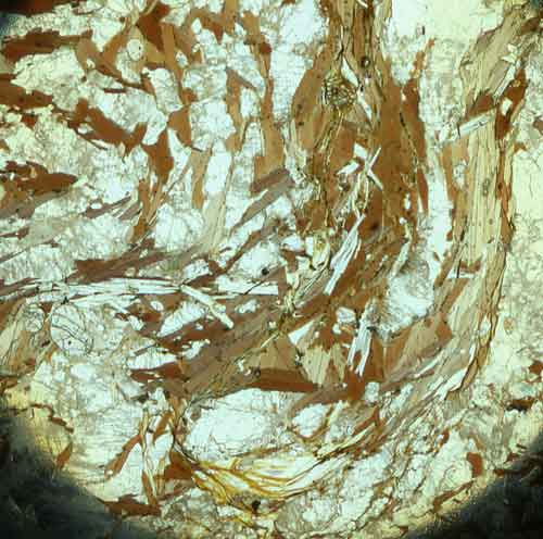 La paragenèse du mélanosome comprend ici les grandes lattes imbriquées de biotite avec nombreuses inclusions de zircon, l’almandin et le disthène, enfin la muscovite.